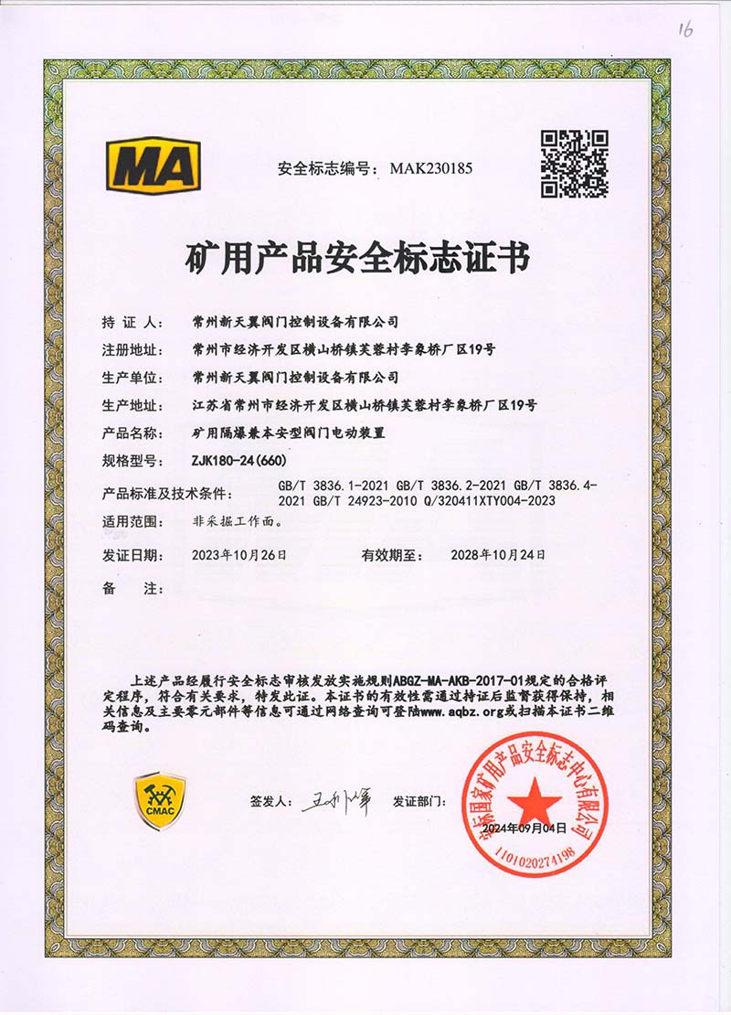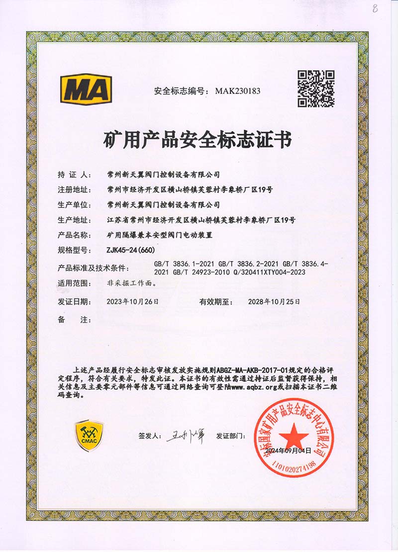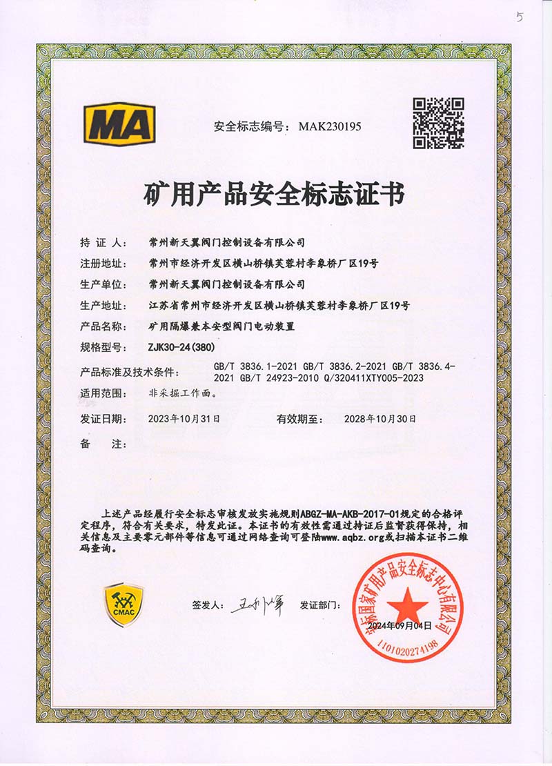 礦用產(chǎn)品安全標(biāo)志證書ZJK180-24(380)