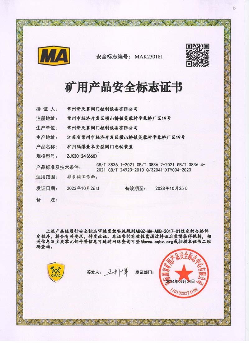 礦用產(chǎn)品安全標(biāo)志證書ZJK30-24(660)