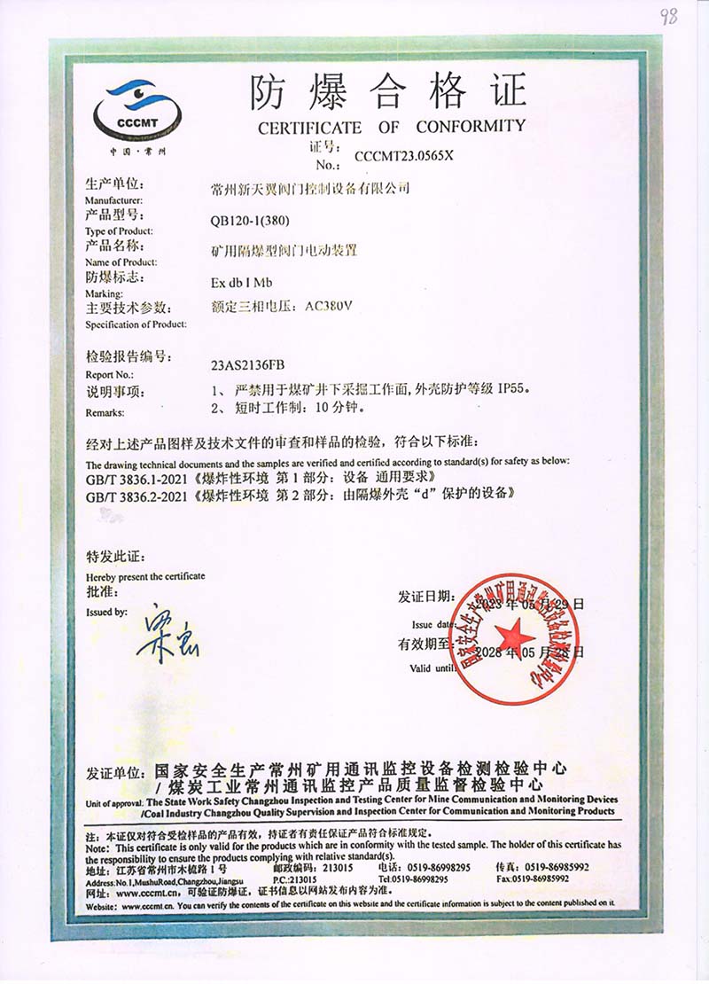 礦用產(chǎn)品安全標(biāo)志證書QB20-1(380)