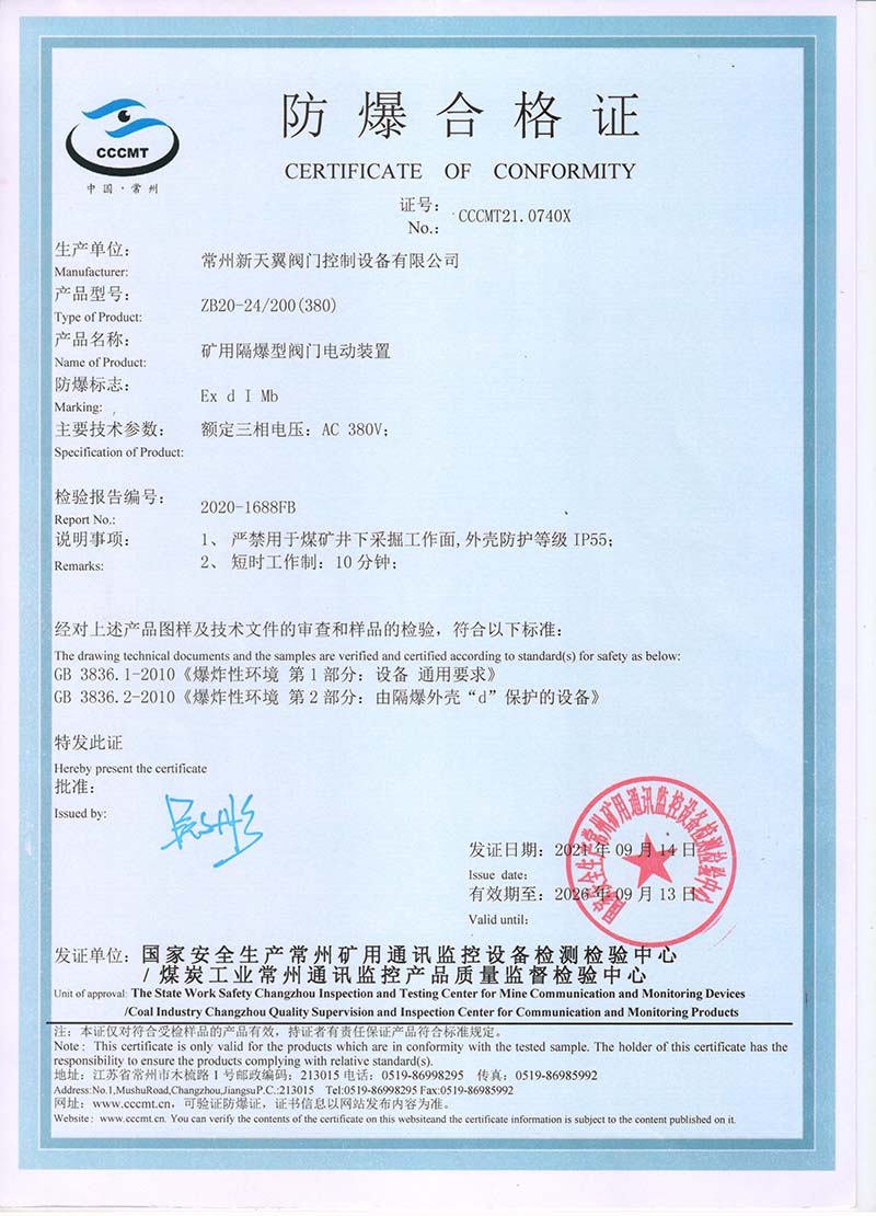 礦用產(chǎn)品安全標(biāo)志證書ZB10-24 200(380)